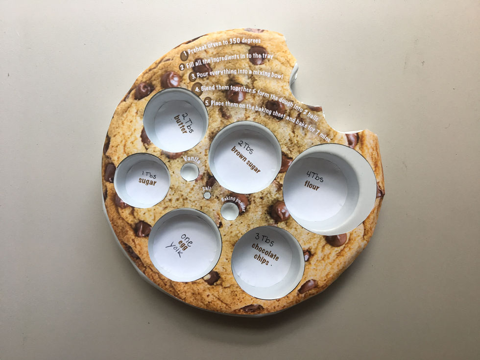 Fill each compartment to the brim with the indicated ingredient. Dump the contents of the tray into a bowl. Mix it together until it forms a dough. Form two balls from the dough, and place them on a baking tray. Bake at 350 degrees for 7 minutes, and enjoy!